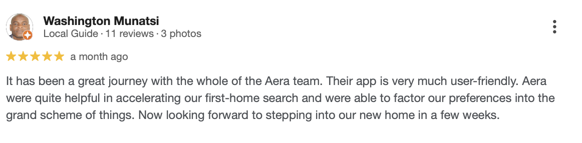 "Huge thanks to the Aera team for helping us on the journey of our first home. They were so efficient and quick in getting us approved from the bank. Worked around the clock to get it done. 2 weeks from my first phone call the loan got approved and they were massive in taking the stress of going to look for a property. They came well planned in properties to look for and agreed on our first viewing which property we want! Highly recommend to first home buyers."