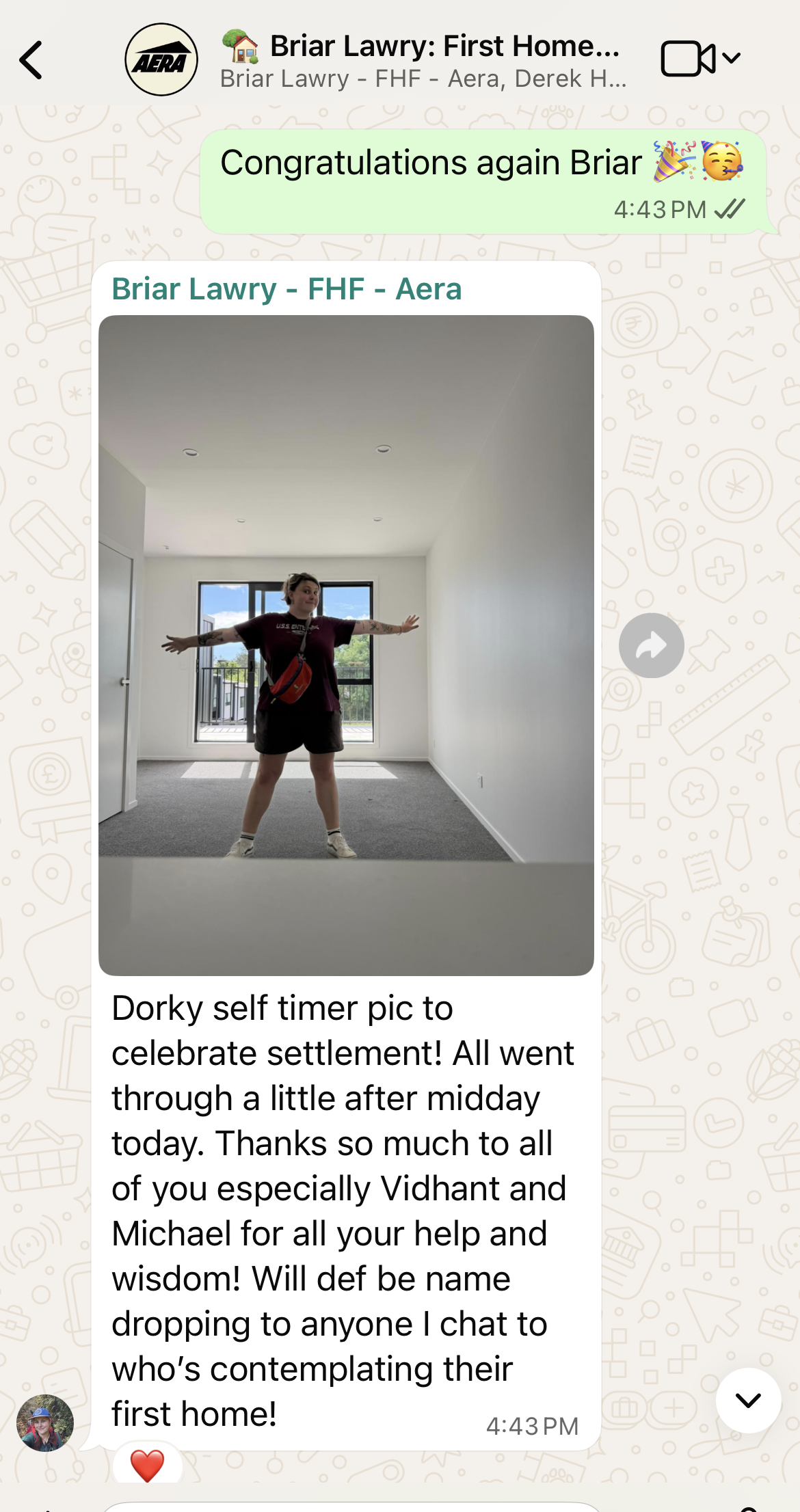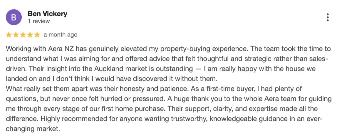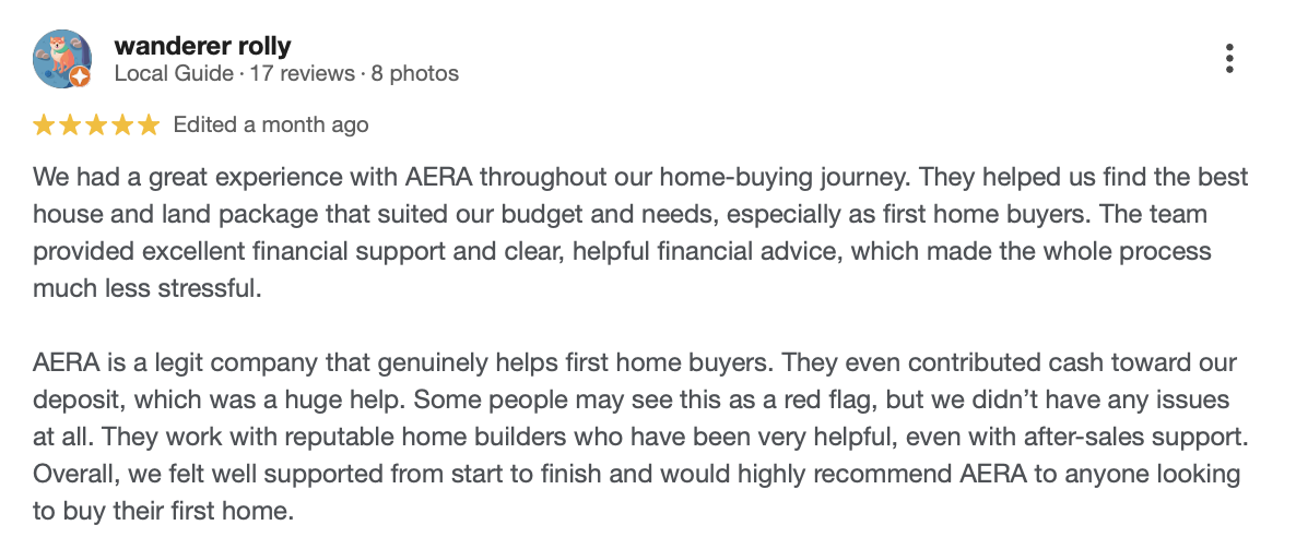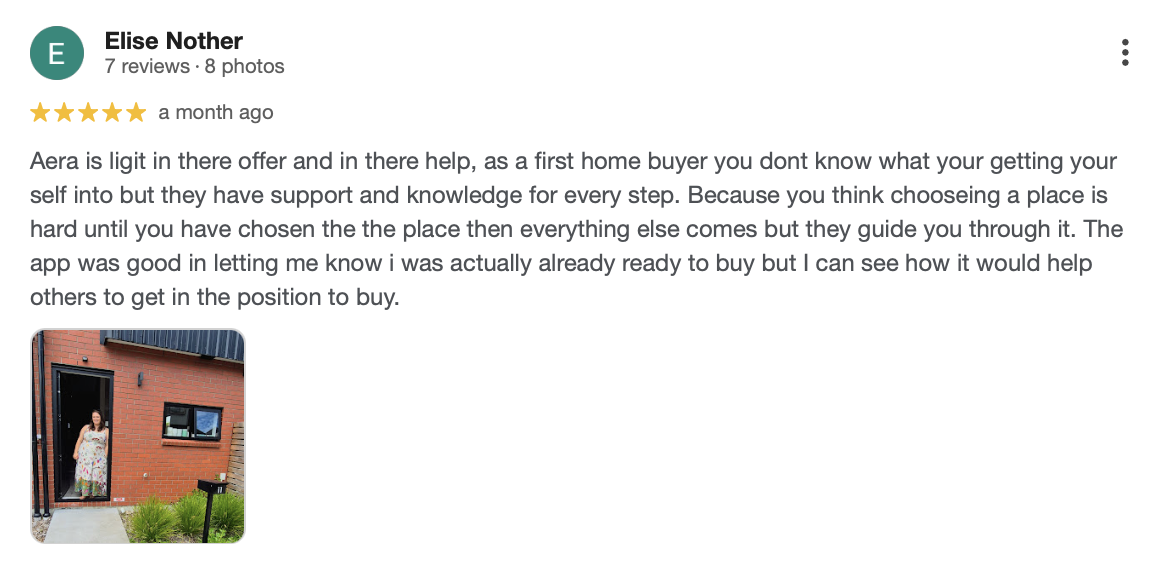 "Aera were absolutely fantastic In helping me achieve my first home. They made the entire process go so smoothly, going above and beyond with replying to my questions at all times of day and night."