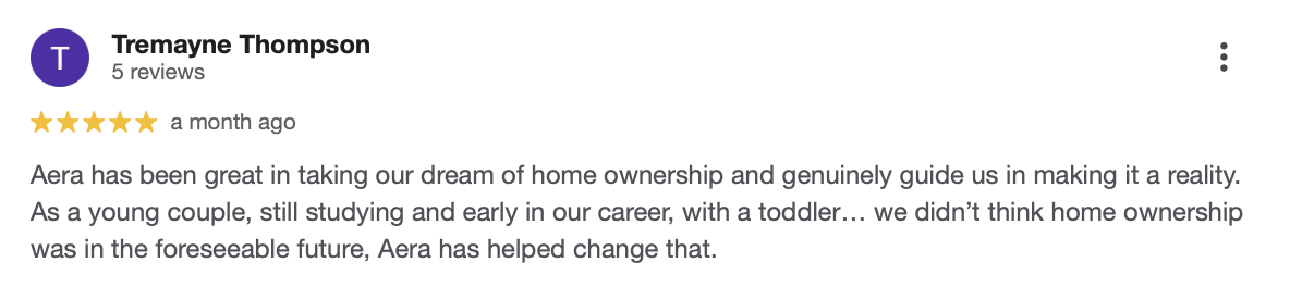 "Aera made buying my first home far less stressful than I expected. The $10K credits and extra help were awesome, but what really made a difference was how easygoing and reassuring the whole experience was. I never felt rushed into anything I wasn't comfortable with, which was a huge ..."